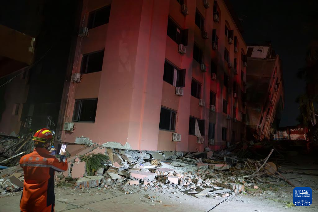 3月30日,在缅甸曼德勒,中国救援队队员在长城饭店开展救援。