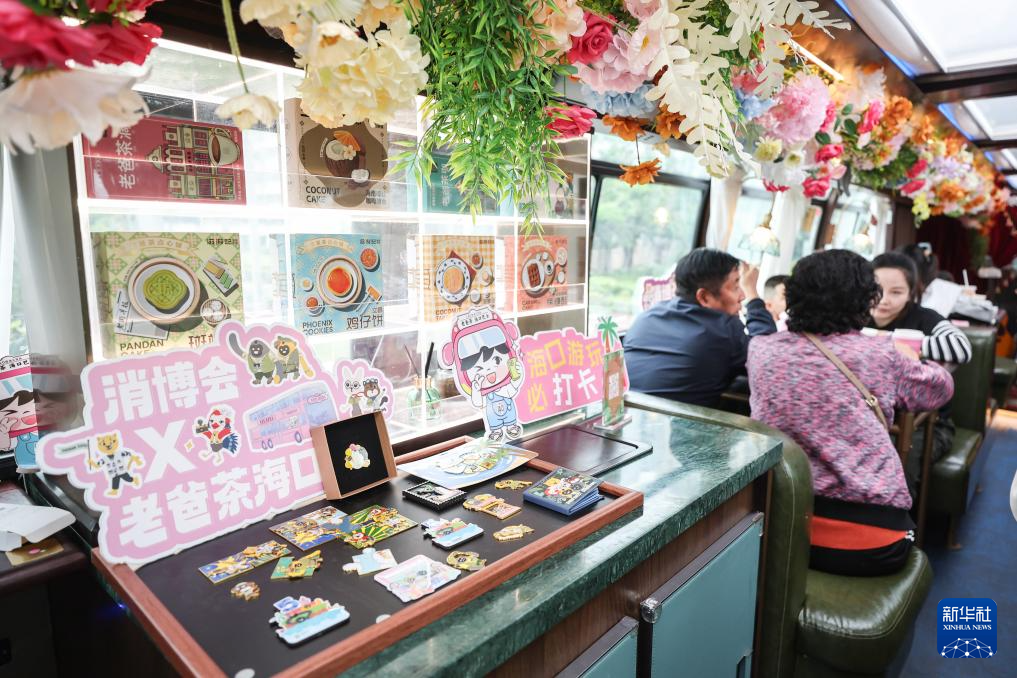 这是老爸茶巴士“消博会专线”上展示的消博会周边产品(4月6日摄)。