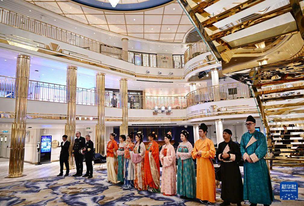 4月6日,“爱达·魔都号”邮轮上的工作人员在大厅迎客。