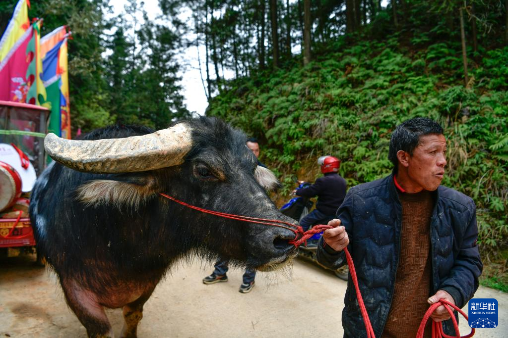 4月6日,在贵州省锦屏县固本乡东庄村,参加斗牛活动的水牯牛准备入场。