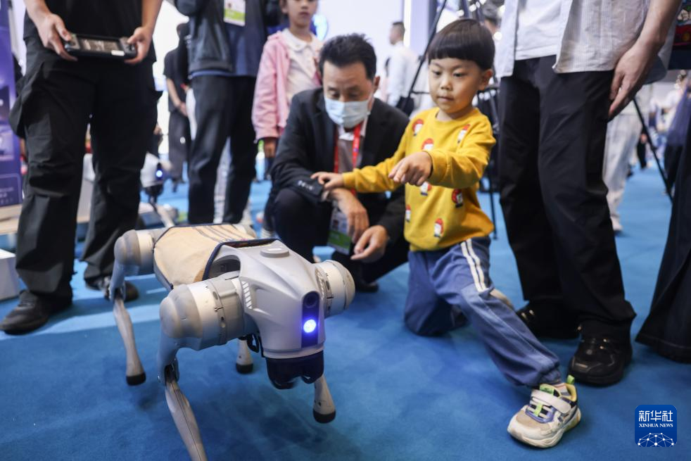 4月13日,在第五届消博会现场,小朋友和宇树科技展示的机器狗互动。