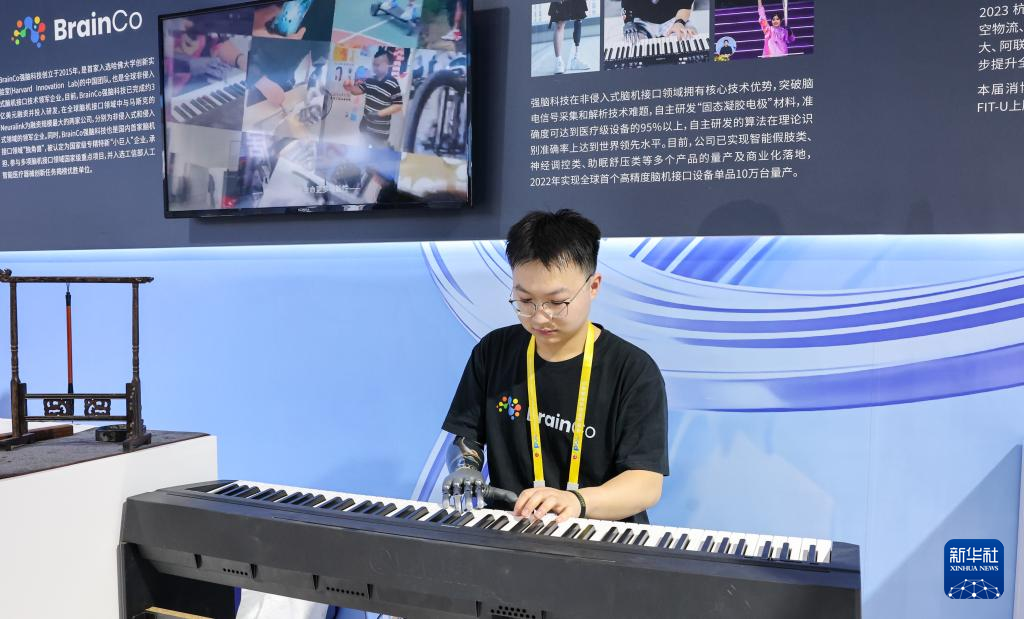 4月13日,在第五届消博会现场,参展商在展示用智能假肢弹琴。