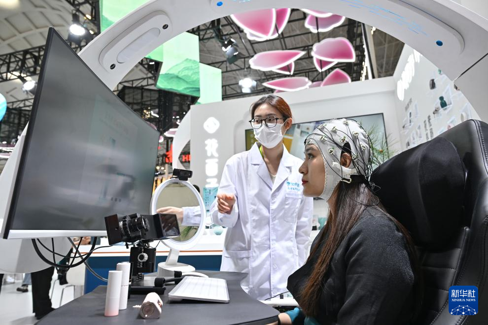 4月13日,展商在消博会现场展示美妆多维全息AI感官行为研究系统,可检测用户对美妆产品满意度。