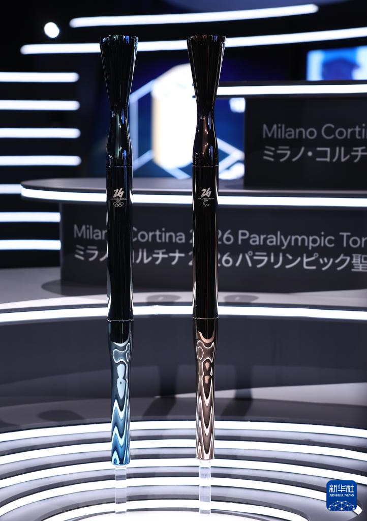 这是4月14日在大阪发布活动现场拍摄的2026年米兰-科尔蒂纳丹佩佐冬奥会火炬(左)和冬残奥会火炬。新华社记者 贾浩成 摄