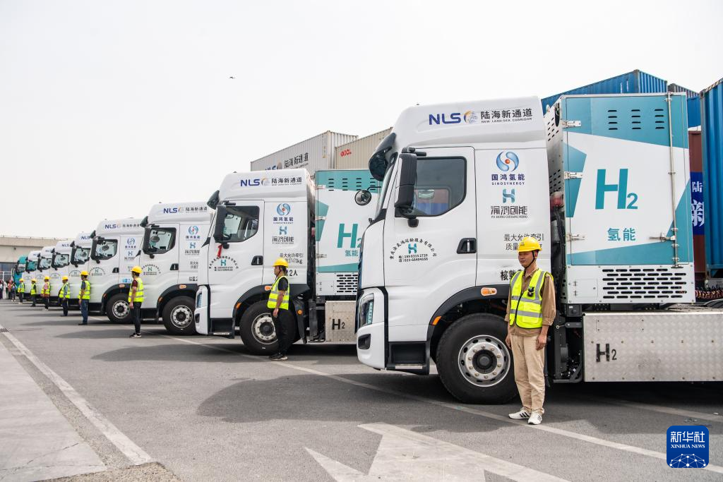 4月14日,氢能重卡在陆海新通道重庆无水港等候发车。