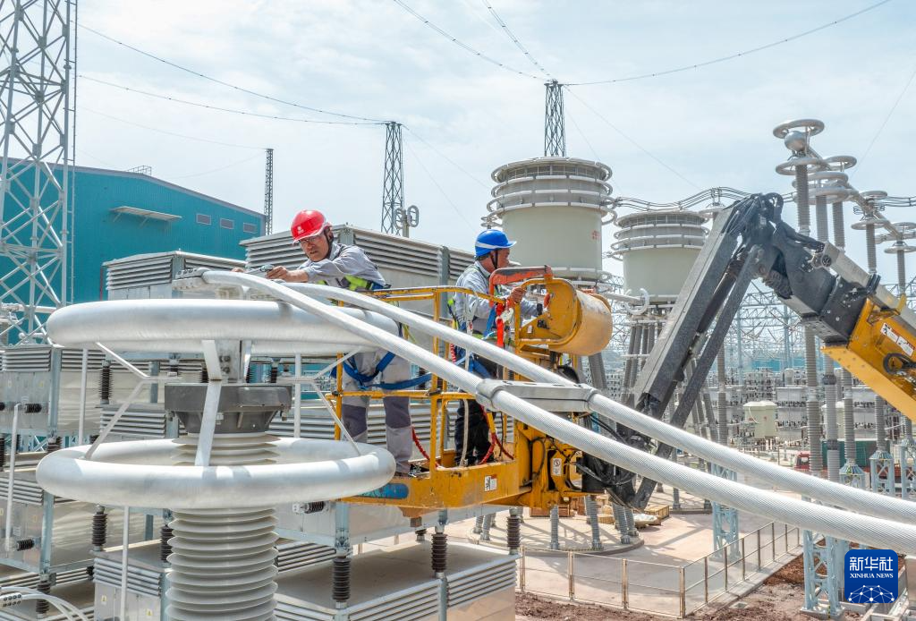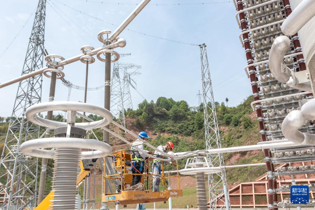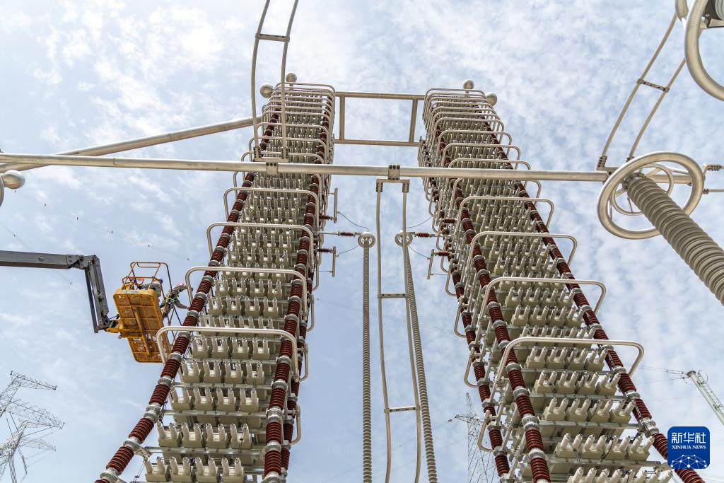 4月16日,安徽送变电工程有限公司施工人员在“疆电入渝”特高压工程渝北换流站建设现场对电容器塔设备进行调试验收。
