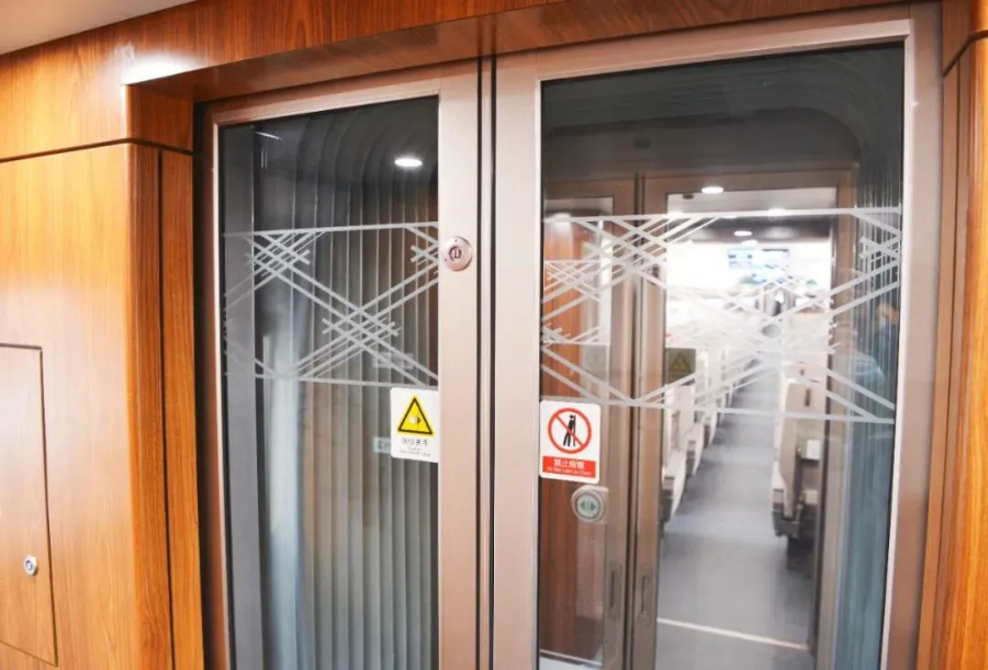 每节客座车厢两端都设有内端门和防火隔断门,内端门关闭后可起到隔音效果。需要注意的是,不可随意倚靠,防止挤伤夹伤。防火隔断门设置在车厢两端处,一般情况下,该隔断门处于敞开状态。当车厢内突发火灾等情况,工作人员在疏散车厢旅客后,会及时关闭防火隔断门,延缓烟火的蔓延。正常情况下,旅客不得随意倚靠或使用防火隔断门,防止隔断门失灵或无法正常工作。