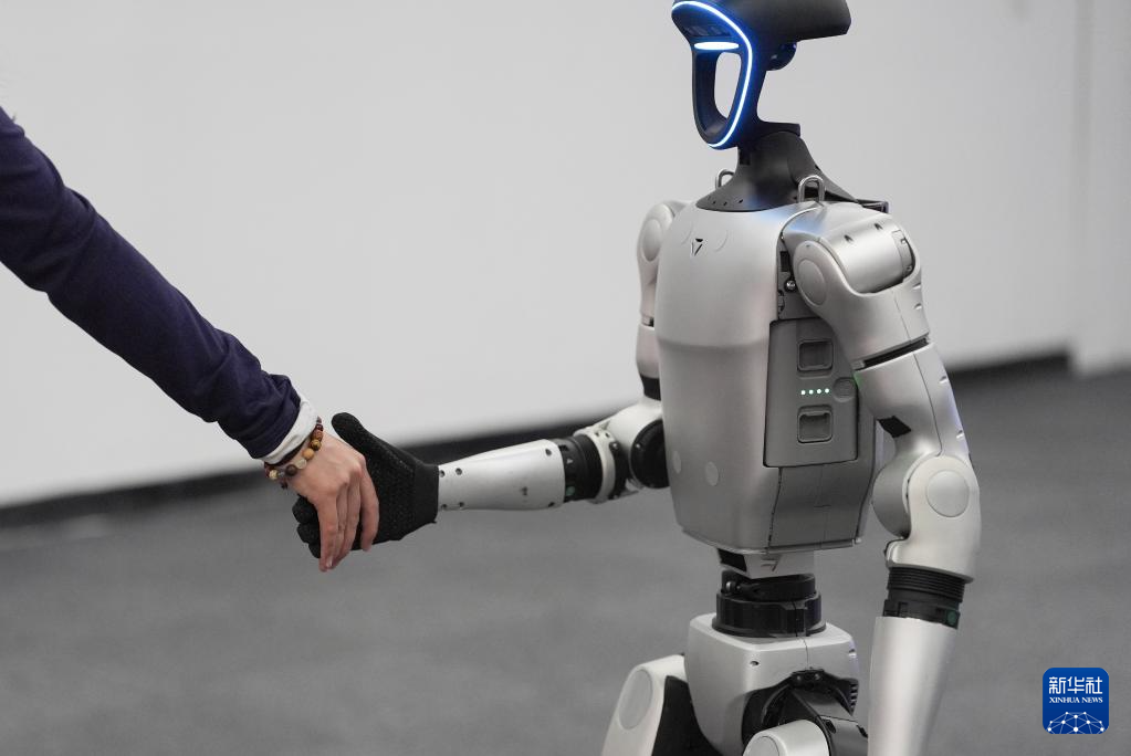 4月23日,在知名机器人公司杭州宇树科技展厅内,宇树人形机器人G1展示握手动作。