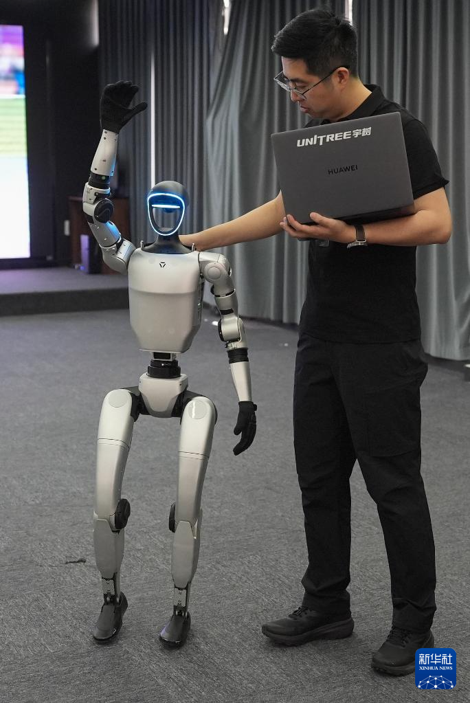 4月23日,在知名机器人公司杭州宇树科技展厅内,宇树人形机器人G1展示本月更新的拥抱、飞吻、“光波”等动作。