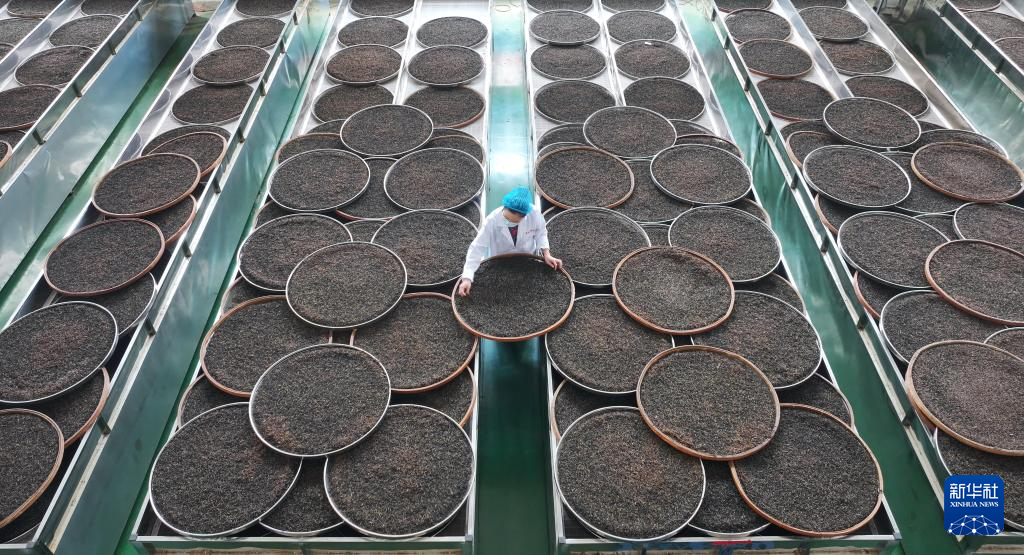 在曹丽琼经营的三江御香茶业有限公司制茶车间,工人在赶制红茶(2024年8月29日摄,无人机照片)。