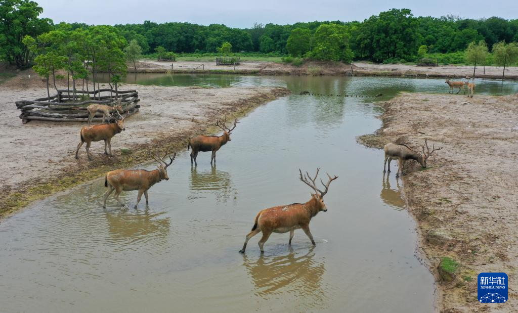 6月7日,在江苏省大丰麋鹿国家级自然保护区,麋鹿在水中散步(无人机照片)。