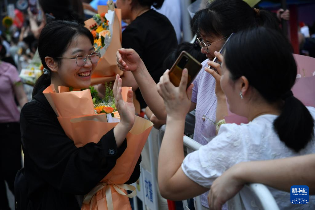 6月9日,在湖南省长沙市天心区长郡中学考点,考生考试结束后与家人交流。