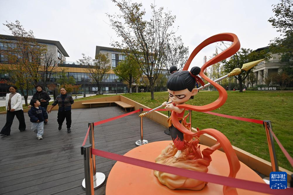 11月2日,人们从成都市天府长岛数字文创园的哪吒雕塑旁走过。天府长岛数字文创园是成都高新区围绕数字文创产业策划打造的专业园区。
