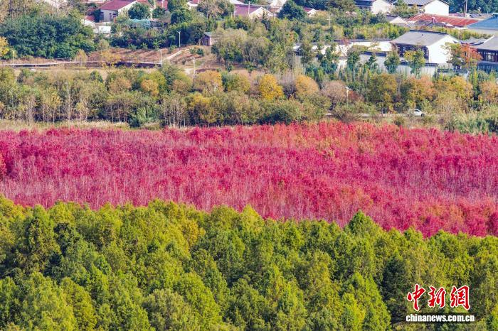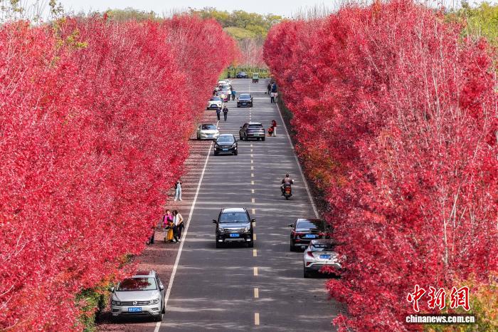 11月3日,江苏南京,大泉湖畔乡村公路两旁枫叶如霞似火,放眼望去,美景如画。(无人机照片)中新社记者 泱波 摄