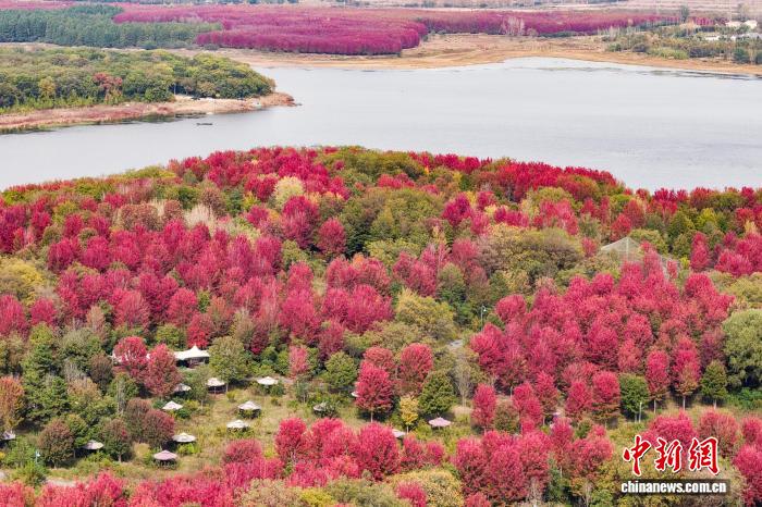 11月3日,江苏南京,大泉湖畔枫叶如霞似火,放眼望去,美景如画。(无人机照片)中新社记者 泱波 摄
