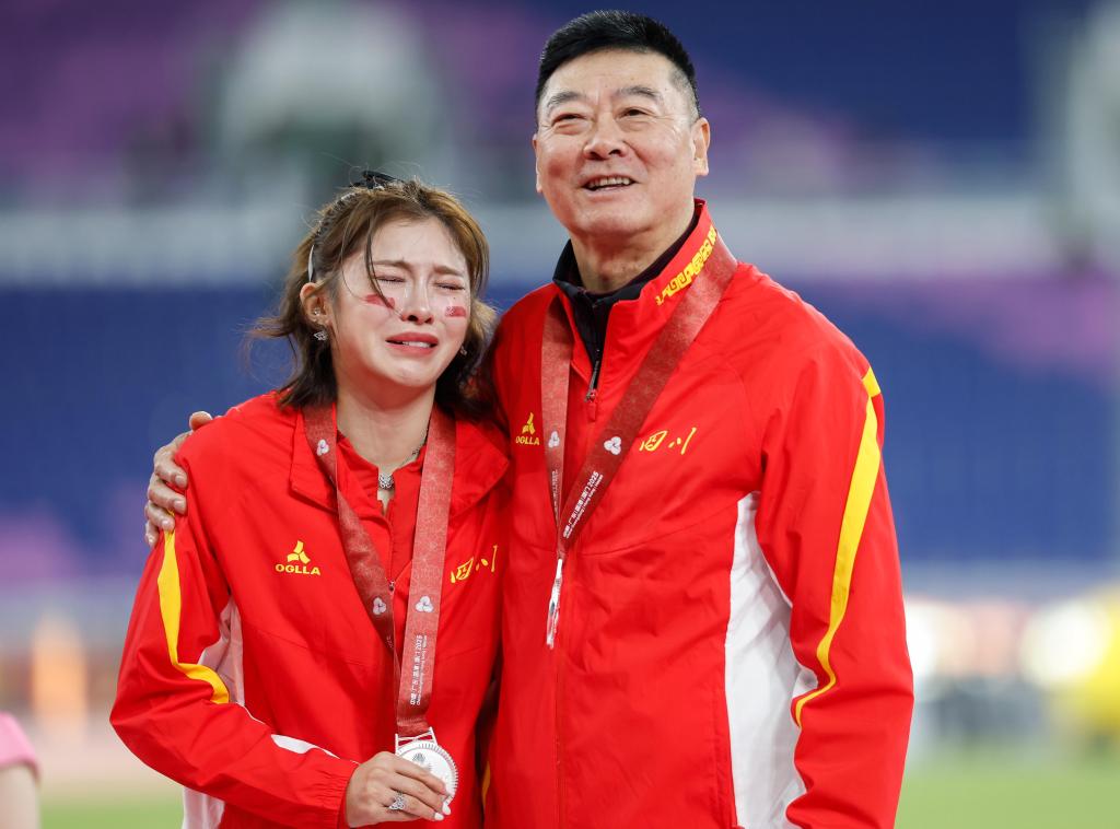 11月19日,获得亚军的四川队选手吴艳妮(左)在女子100米栏颁奖仪式上哭泣。 新华社记者 黄伟 摄