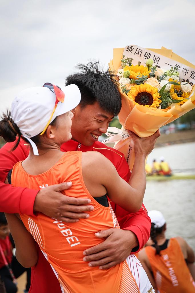 11月11日,河北队赛艇选手韩崴为获得女子四人单桨决赛冠军的女朋友湖北队选手吴咏梅送上鲜花。新华社记者 潘昱龙 摄