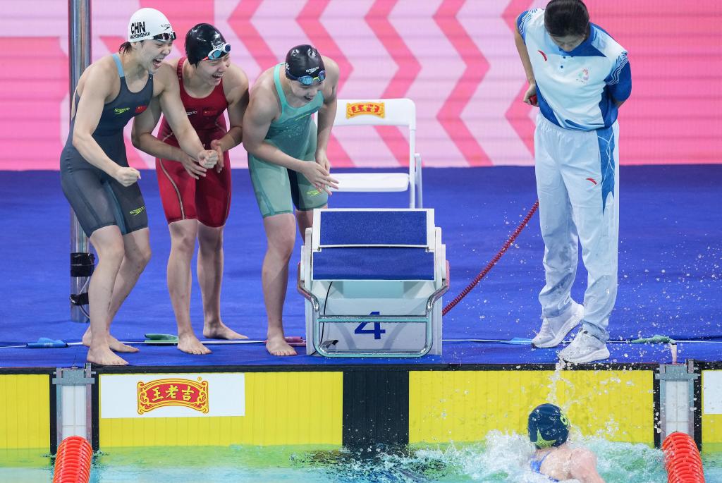 11月14日,河北队选手马永慧、张可、于子迪(上,从左至右)在李冰洁(下)触壁时庆祝夺得女子4X200米自由泳接力冠军。 新华社记者 杜宇 摄
