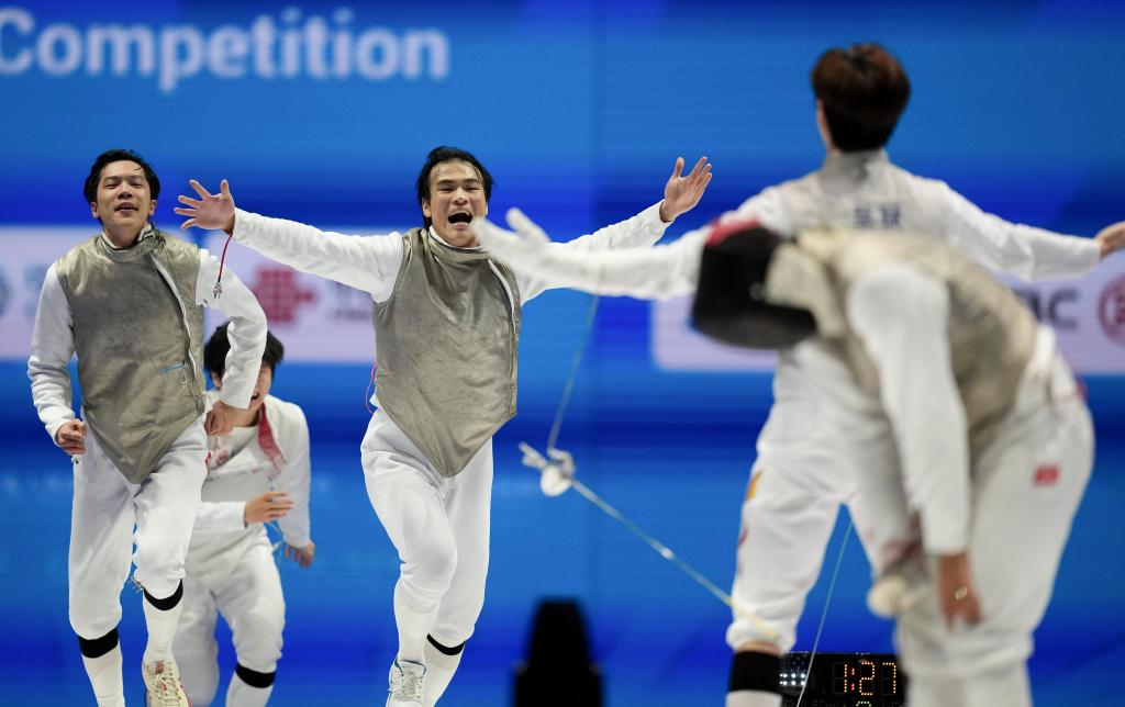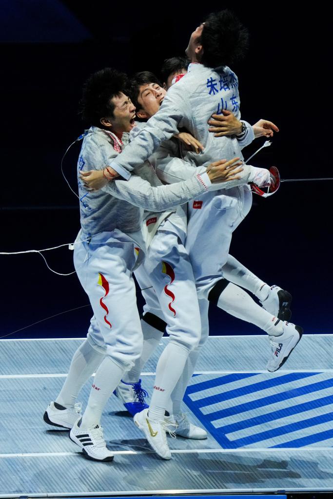 11月18日,山东队选手在男子佩剑团体金牌赛后庆祝胜利。 新华社记者 朱炜 摄
