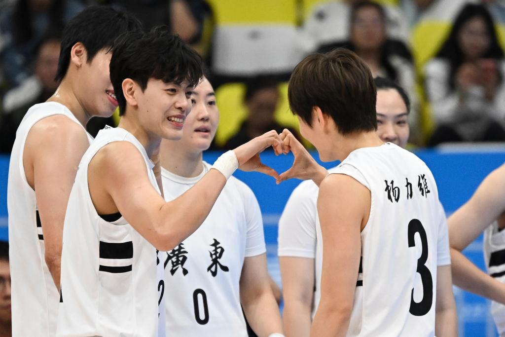 11月15日,广东队球员杨舒予(上左)与杨力维(上右)在篮球女子成年组颁奖仪式上与母亲(下左)互动。新华社记者 邹竞一 摄