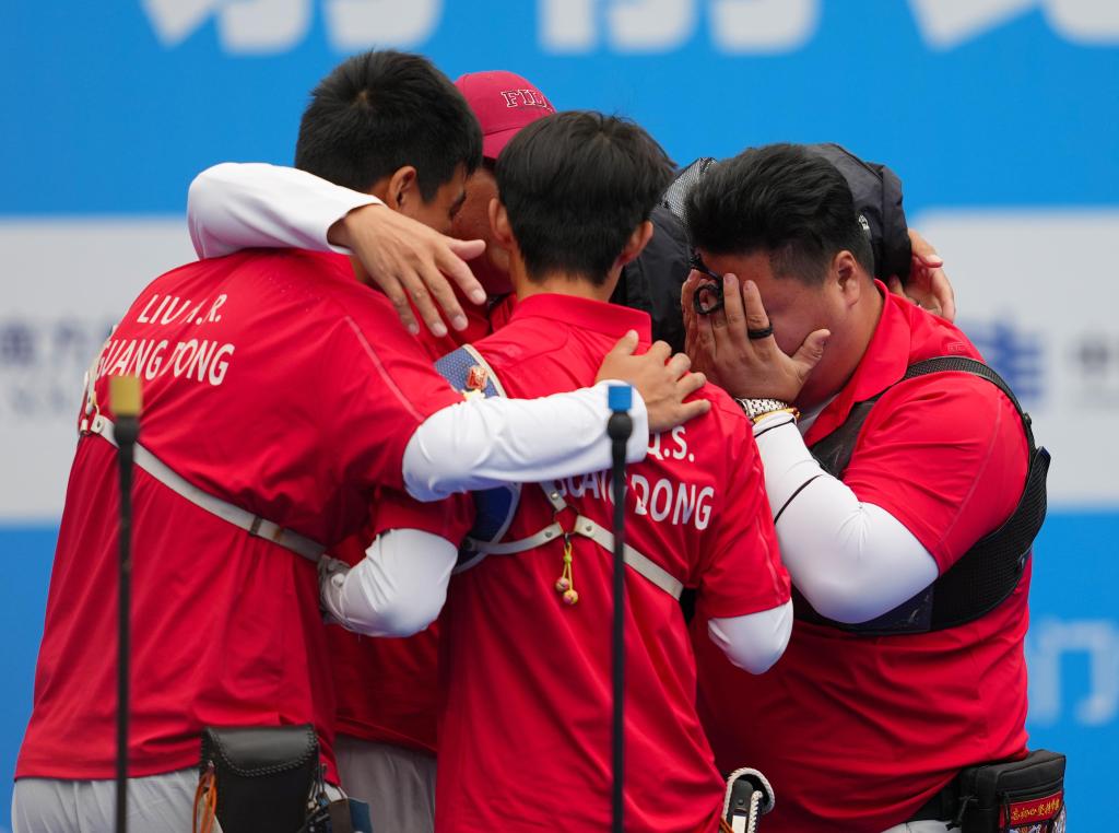 11月19日,广东队选手刘浩然(左)、袁权森(中)、林良文在射箭男子反曲弓团体铜牌赛后庆祝胜利。 新华社记者 郝源 摄