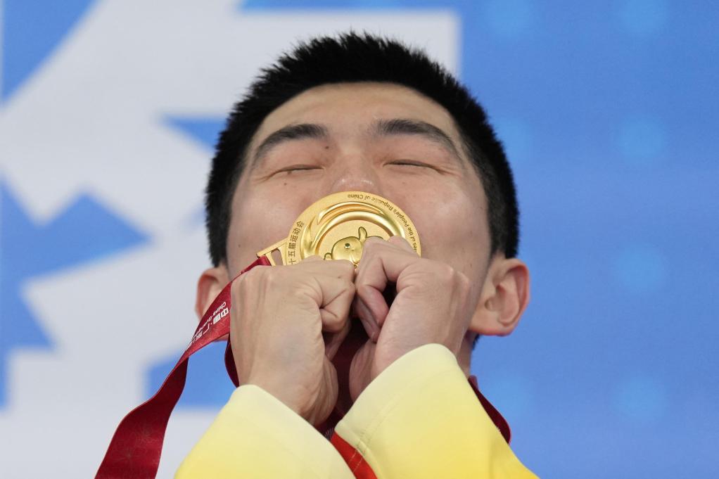 11月17日,湖北队选手闫子贝在男子4X100米混合泳接力颁奖仪式上亲吻金牌。 新华社记者 薛宇舸 摄