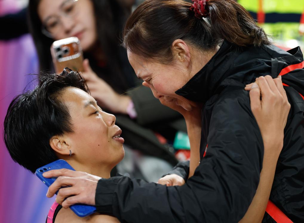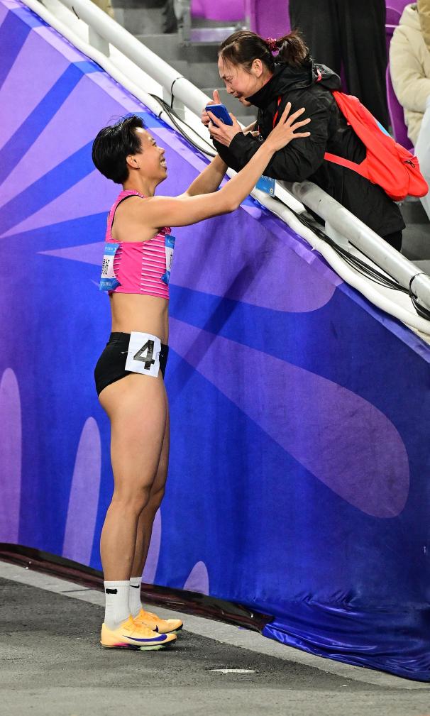 11月19日,冠军广东队选手刘景扬(左)在女子100米栏决赛后和母亲交流。新华社记者 江汉 摄