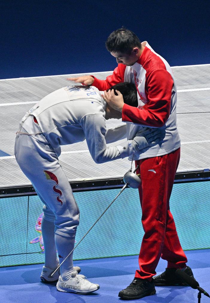11月17日, 安徽队选手俞乐凡 (左)在击剑男子重剑个人金牌赛后与教练庆祝获胜。新华社记者 陈铎 摄