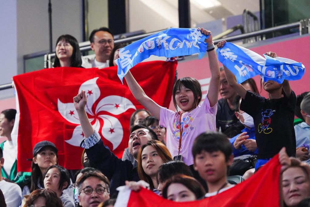 11月16日,观众在击剑男子花剑个人铜牌赛现场为香港队选手张家朗加油。新华社记者 朱炜 摄