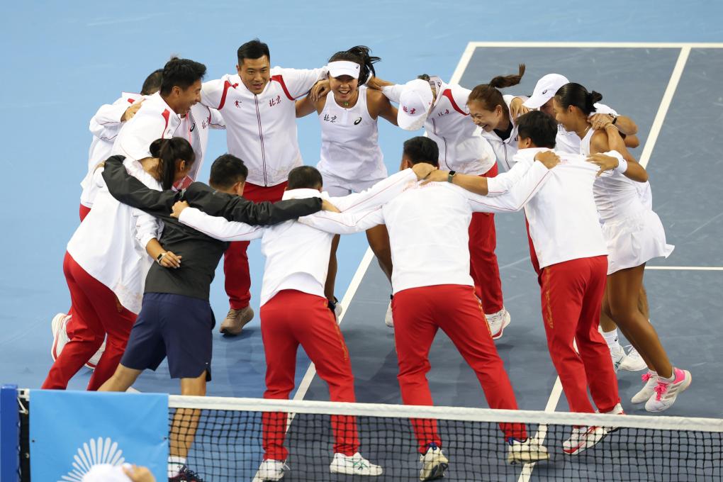 11月12日,北京队在网球项目青年组女子团体决赛后庆祝夺冠。新华社记者 张晨霖 摄