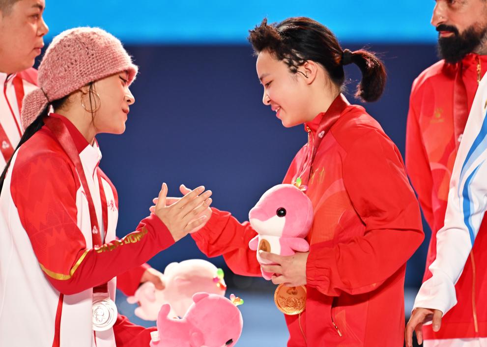11月10日,获得冠军的湖北队选手王宗源(右)在颁奖仪式上与广东队选手全红婵合影。 新华社记者 肖艺九 摄
