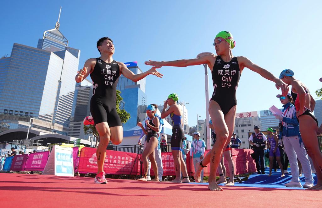 11月16日,辽宁队选手王楠贺、陆美伊(前右)在铁人三项混合接力决赛中接力。新华社发(吕小炜摄)