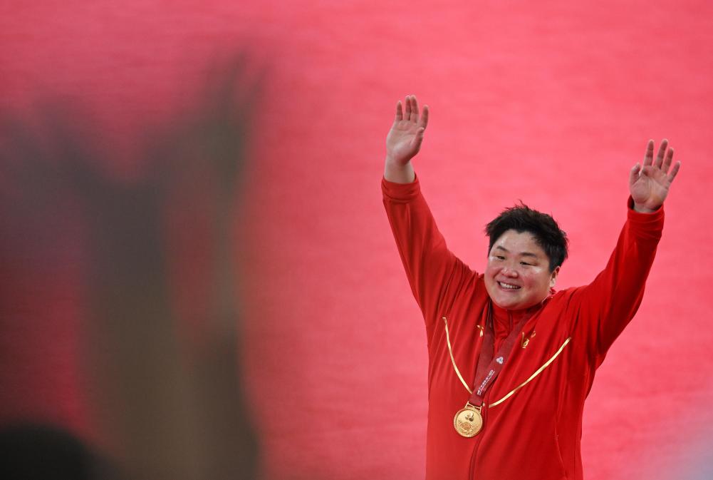 11月16日,河北队选手巩立姣在女子铅球颁奖仪式后向观众致意。新华社记者 周牧 摄