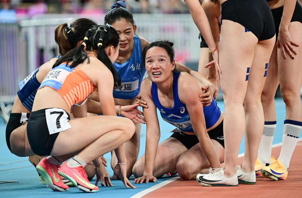 11月15日,福建队选手葛曼棋(左)和湖北队选手李贺(右)安慰在4X100米混合接力决赛中摔倒的广东队选手梁小静。新华社记者 李一博 摄