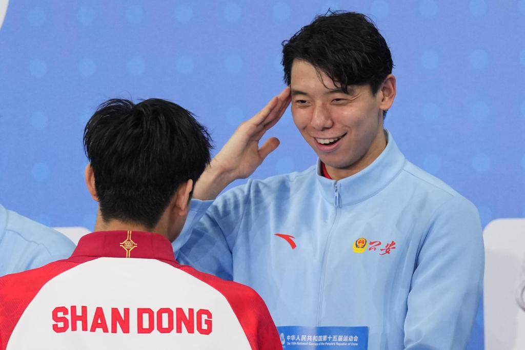 11月15日,中国公安体育协会队选手季新杰(右)和山东队选手张展硕在男子4X200米自由泳接力颁奖仪式上。新华社记者 薛宇舸 摄