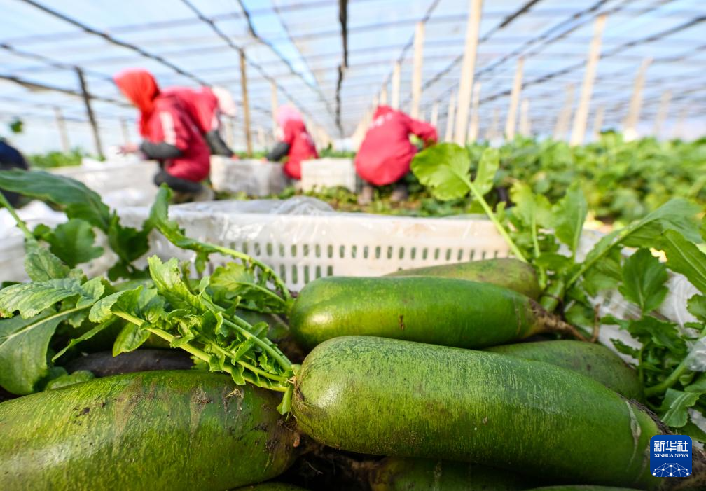 11月20日,在天津市西青区辛口镇种植沙窝萝卜的大棚内,农民在采摘萝卜。