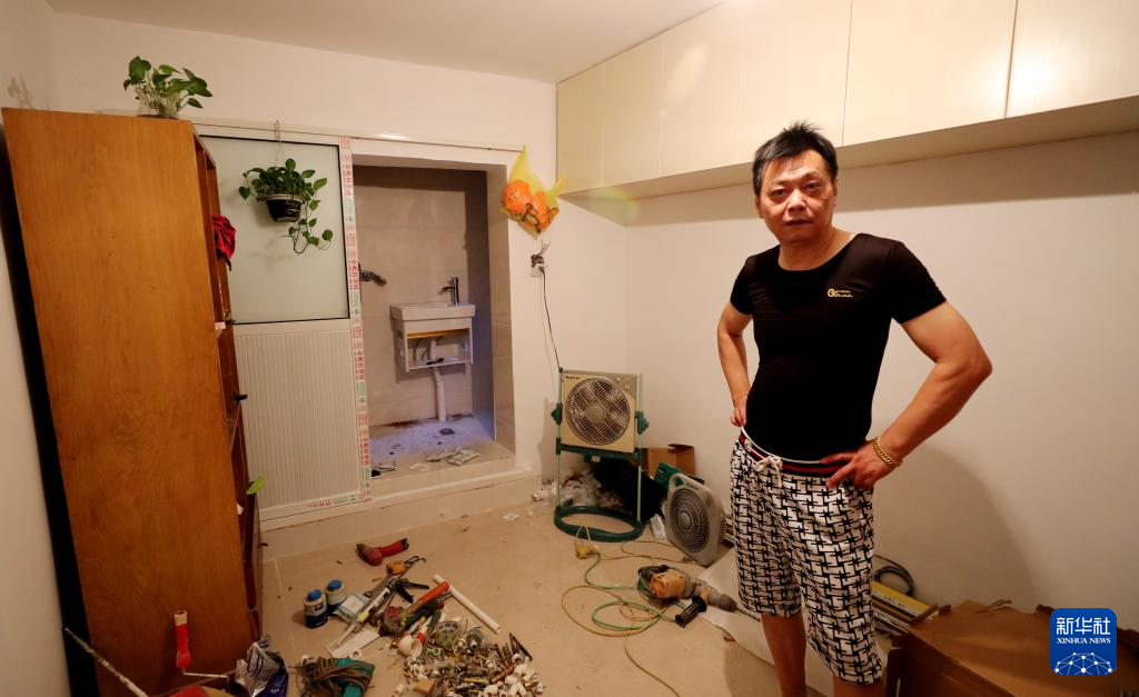 2019年7月18日,宝昌路731弄小区居民方益群站在家中,他家正在进行卫生间改造施工。