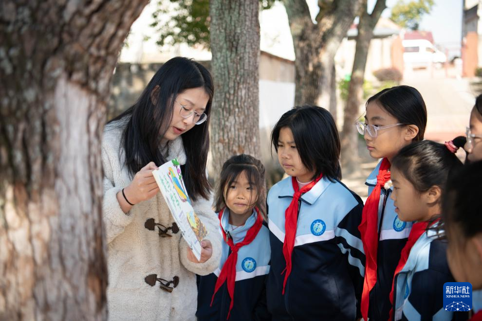 11月18日,在安徽省池州市贵池区墩上中心学校茅坦小学,一位老师向学生们讲解鸟类保护常识。