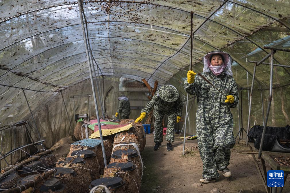 11月19日,在云南省保山市龙陵县龙山镇,黄氏蜂业有限公司工人在育蜂棚内辅助胡蜂人工交配。
