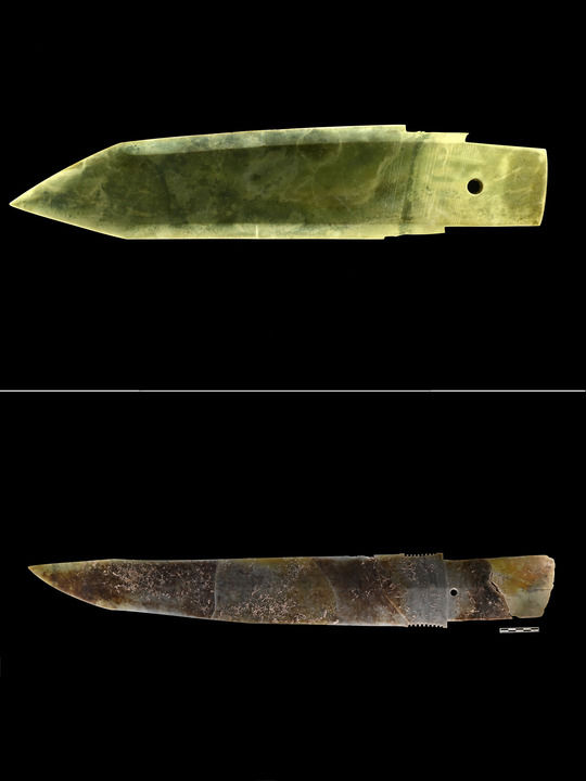 这是一张拼版照片:上图为二里头遗址出土的玉戈(中国社会科学院考古研究所二里头工作队提供);下图为郑州商城遗址出土的玉戈(郑州市文物考古研究院提供)。新华社发