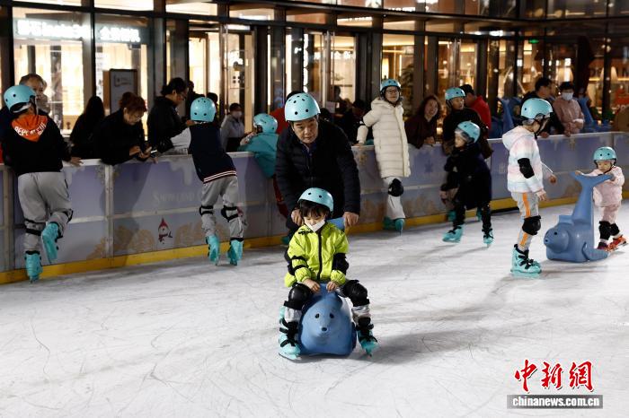 12月1日晚,游客带着孩子在滑冰。中新社记者 殷立勤 摄