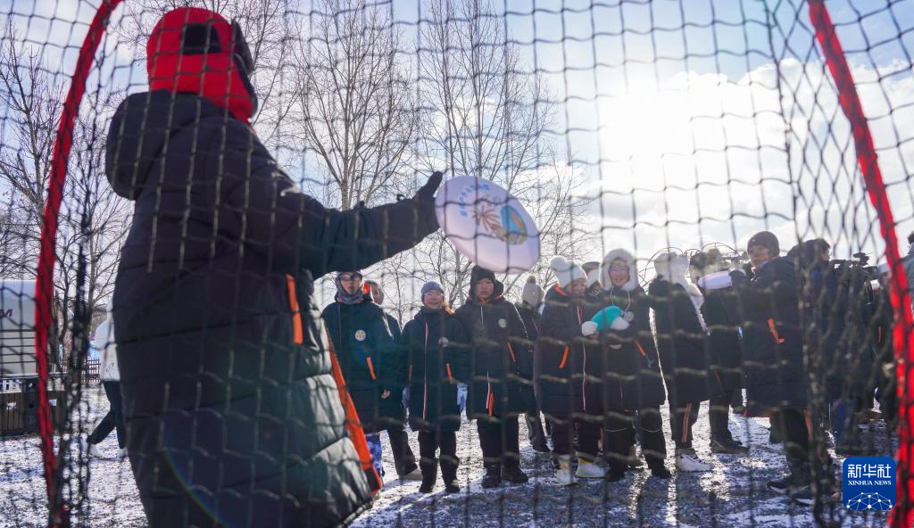 12月3日,吉林市第一实验小学学生在吉林市纳美山谷度假区体验雪地飞盘。