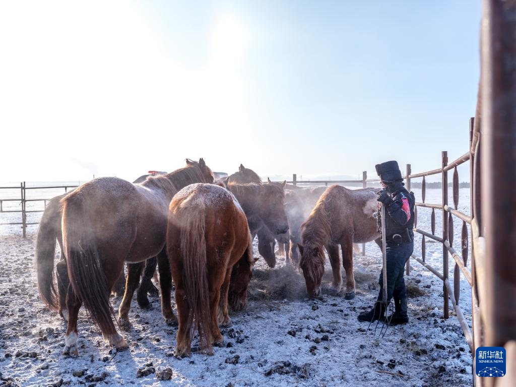 12月2日,在内蒙古呼伦贝尔市陈巴尔虎旗,“海东青”骑警队骑警在马圈中喂马。