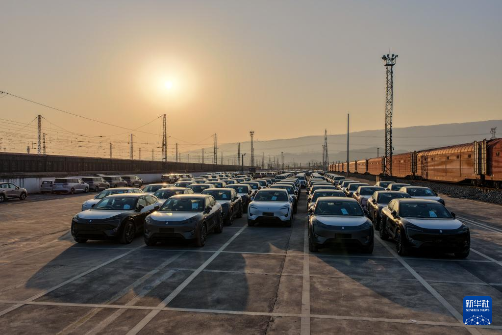 11月29日,在重庆果园港国家物流枢纽铁路货运鱼嘴站商品车物流基地,“重庆造”新能源汽车等待装入一旁的“渝车”专列出海(无人机照片)。