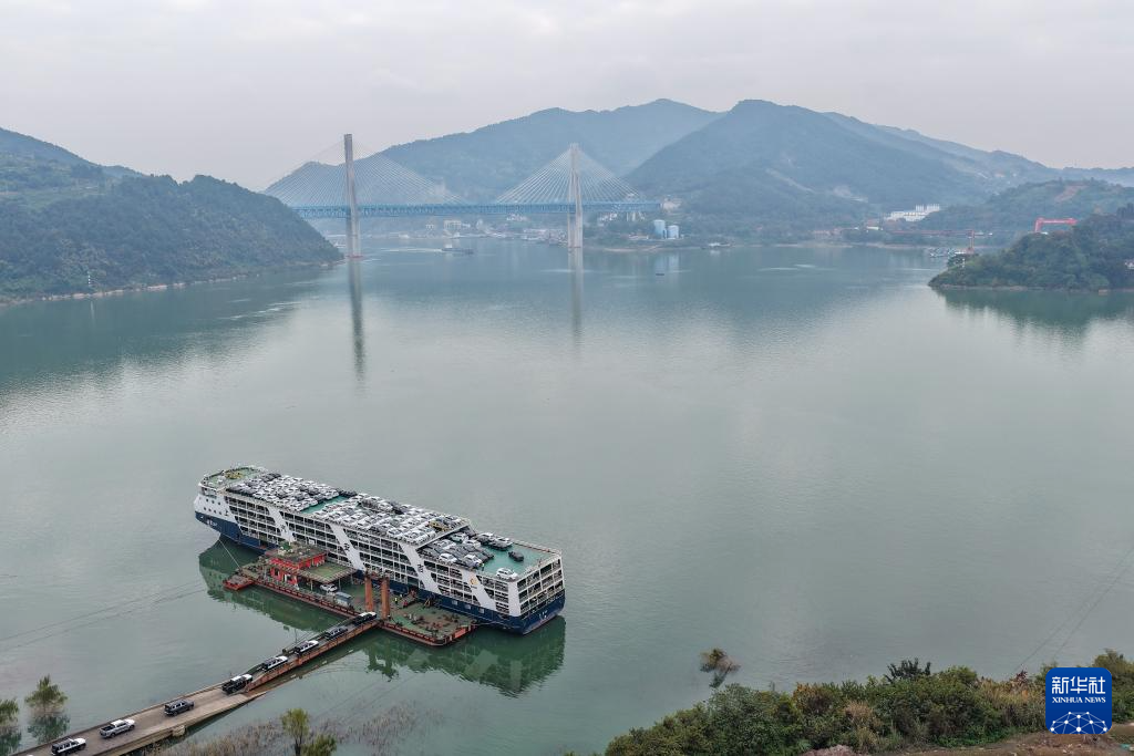 12月5日,在重庆果园港滚装码头,“重庆造”新能源汽车在装船,之后将通过“江海联运”的方式出海(无人机照片)。