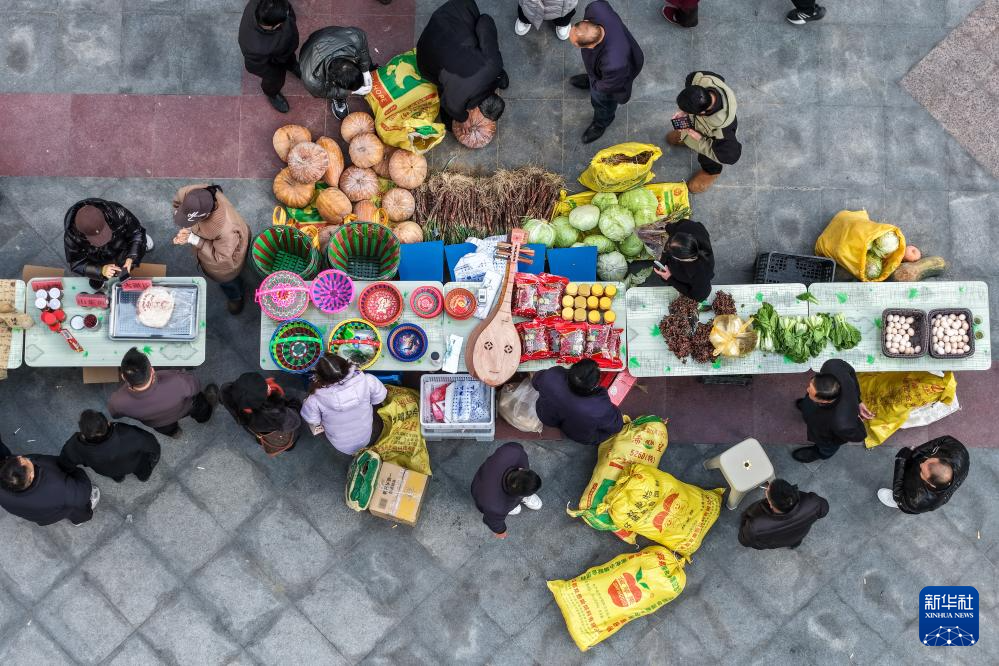 12月13日,居民在陇南市武都区“冬至大集”上选购特色农产品(无人机照片)。