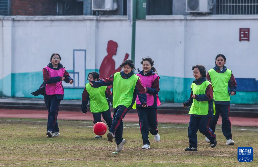 12月16日,轧村中学的学生们在阳光大课间活动中参加足球游戏。