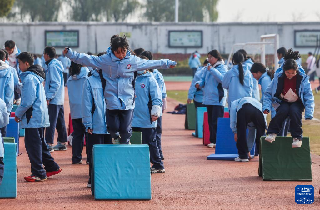 12月16日,轧村中学的学生们在阳光大课间活动上参加跳跃游戏。