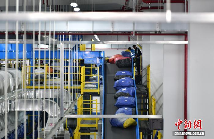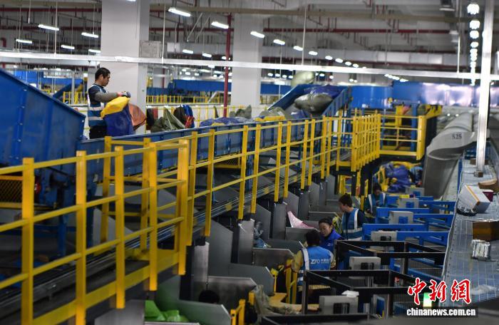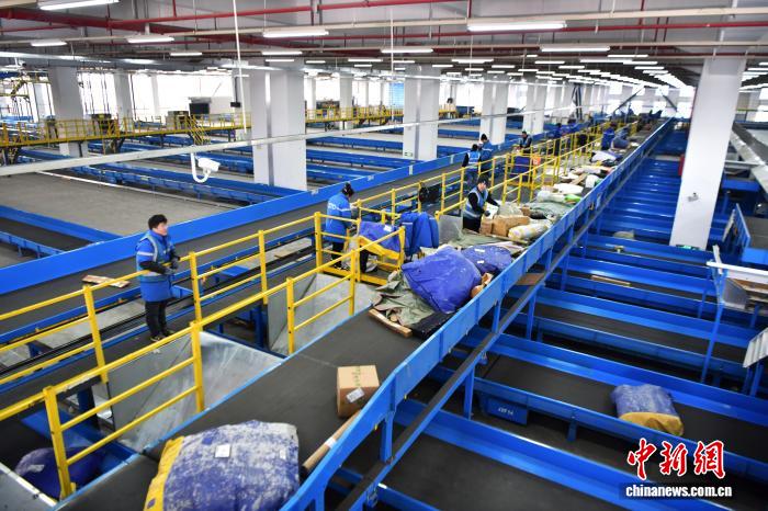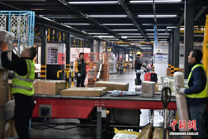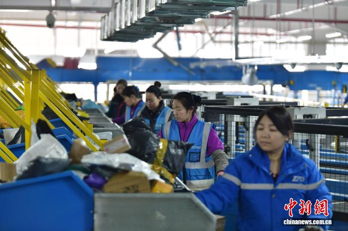 12月17日,位于河北省廊坊市广阳区的一家快递企业北方总部,工作人员正在岗位上忙碌。中新社记者 翟羽佳 摄