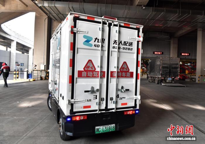 12月17日,位于河北省廊坊市开发区的一家快递转运中心,一辆无人配送车开始“工作”。中新社记者 翟羽佳 摄